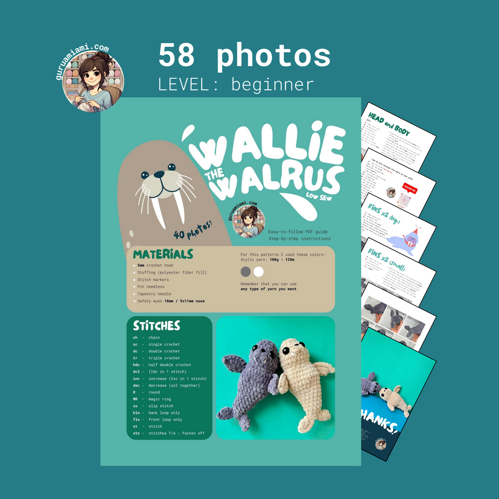 Wallie the walrus - LOW SEW - crochet amigurumi pattern PDF